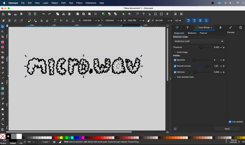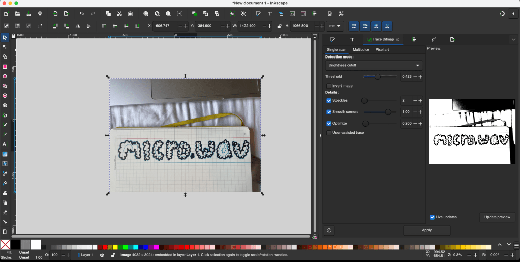 4. Basically this is creating a vector map of your image, ie reducing it to a series of points and lines that can be scaled/manipulated. There’s a bunch of different algorithms to do this but I found that setting “detection mode” to “brightness cutoff” and adjusting the threshhold to taste works pretty well